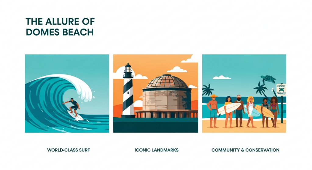 The allure of Domes Beach extends far beyond its surfable waves, encompassing unique landmarks that contribute to its distinctive character and visual appeal.